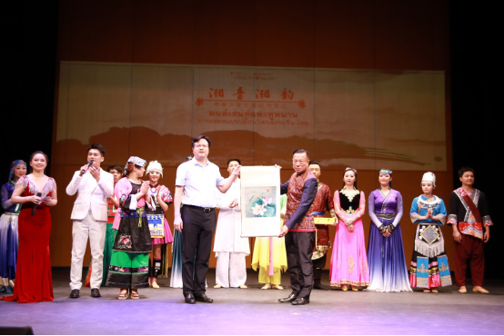 张野同志作为“湘音湘韵”中泰文化交流艺术团团长向诗纳卡林维洛大学赠送湘绣纪念品